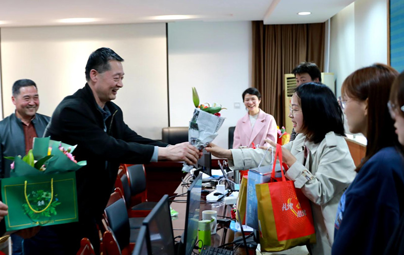 陽春三月,繁花似錦。設計院公司引大濟岷項目組集中設計辦公室卻是一派繁忙,無人賞花。確切的講,從正月初三起,這個團隊就已經開始新年奮蹄疾、全力赴征程的戰斗。她們秉承著“金牛玉虎闖機遇,引大濟岷續偉業”的鏗鏘誓言,靠著“996”“白加黑”的非常規工作模式,攻克了我省最復雜都江堰供水區水資源配置問題,保障了引大濟岷可研進度,用青春繪就了一張張水網藍圖。馬勇仕一行向節日仍奮戰在一線的女職工們獻上鮮花,送上慰問品,并對項目組取得的成績表示祝賀。在得知設計團隊平均年齡34歲,且女職工占比近70%后,馬勇仕表示:這樣的團隊讓我們感到新時代女性建功立業的決心,更讓我們看到四川水利的希望,這是巾幗建功新時代的真實寫照;鼓勵全體女職工要敢于做追夢的奮斗者,再接再厲、再創佳績,以堅定的責任感和使命感,全力推動引大濟岷這一國家和四川水網體系的骨干工程早日開工建設。
