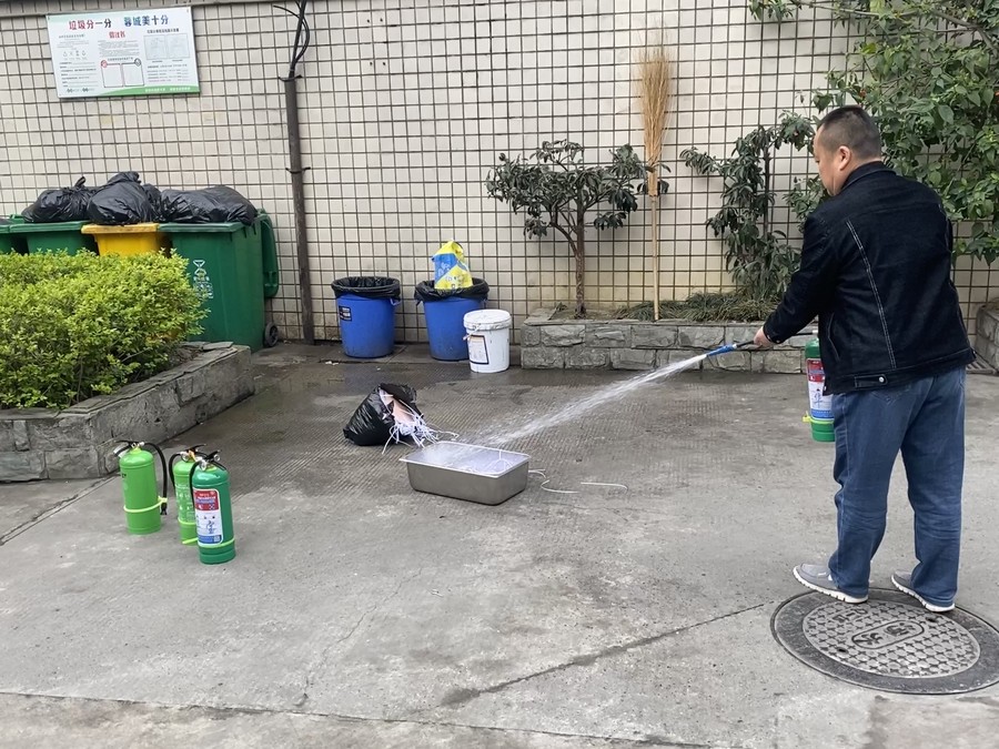 演練開始后,消防安全管理人員認真指導員工正確使用手提滅火器進行滅火演練。面對火情,員工們表現沉著冷靜,正確地使用滅火器將燃起的明火迅速撲滅。