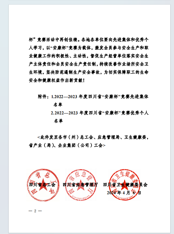 喜報!集團榮獲2022-2023年度四川省“安康杯” 競賽先進集體和優秀個人